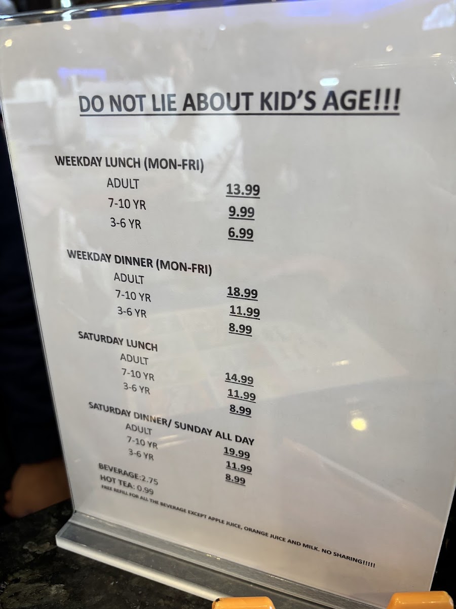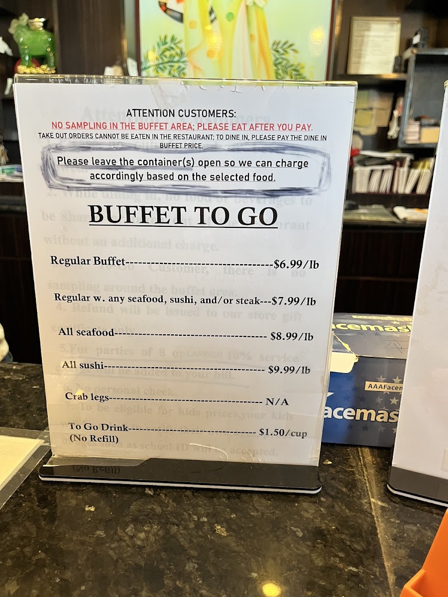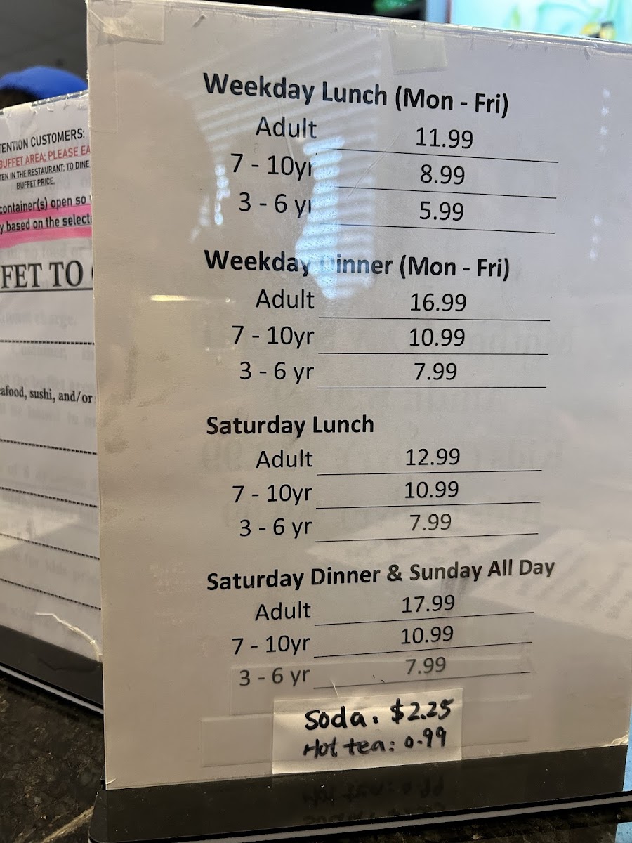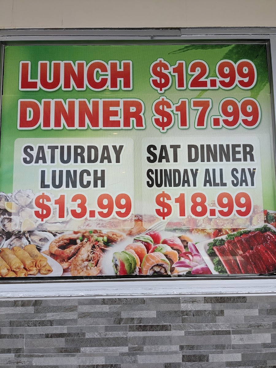 This menu is designed for casual dining and buffet-style service, suitable for lunch or dinner. Visitors typically choose items by weight from the buffet stations, which offer freshly prepared dishes including grilled specialties and cold selections. The broad variety caters to those seeking seafood, sushi, or a combination of buffet items in one meal.