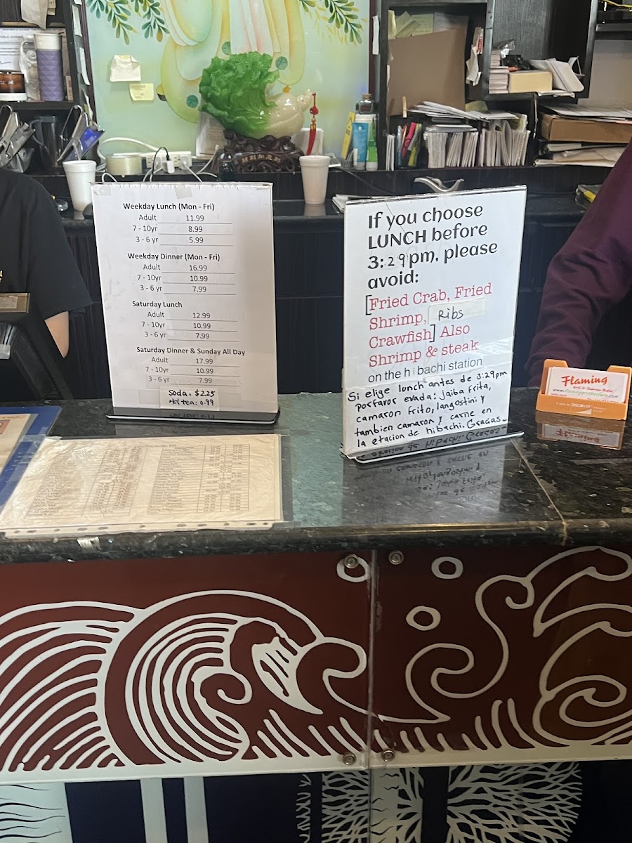 Within the buffet selections, guests can find a diverse range of food items such as crab legs, lobster, crab meat, fried shrimp, hibachi noodles, and sushi rolls like the California Roll. There is also a salad bar available for lighter options, complemented by fresh fruit selections. For dessert, the menu includes choices like tiramisu, jello, and a chocolate fountain feature, as well as fortune cookies.